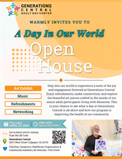Step into our world to experience a taste of the joy and engagement fostered at Generations Central. Enjoy refreshments, make connections, and explore the beautiful art pieces crafted in the minds of our senior adult participants living with dementia. This is your chance to see what a day at Generations Central is all about and how our program is improving the health of our community.