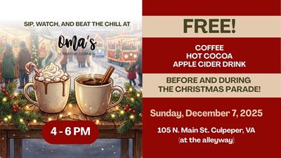 Before the floats start rolling by, stop into Oma’s Creative Corner to grab a FREE cup of coffee, hot cocoa, or apple cider drink to beat the December chill during the Culpeper Christmas Parade.