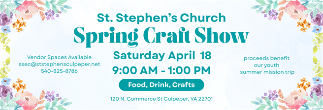 Join us for our second Spring Craft Fair. We will have vendors, crafters, food, and games for all to enjoy. Proceeds help fund our youth mission trip to Pennsylvania. Vendor/crafter spaces available, sign up here https://forms.gle/rucng77nSD4kSF6u8 or contact Karyn for more details, ssec@ststephensculpeper.net or 540-825-8786